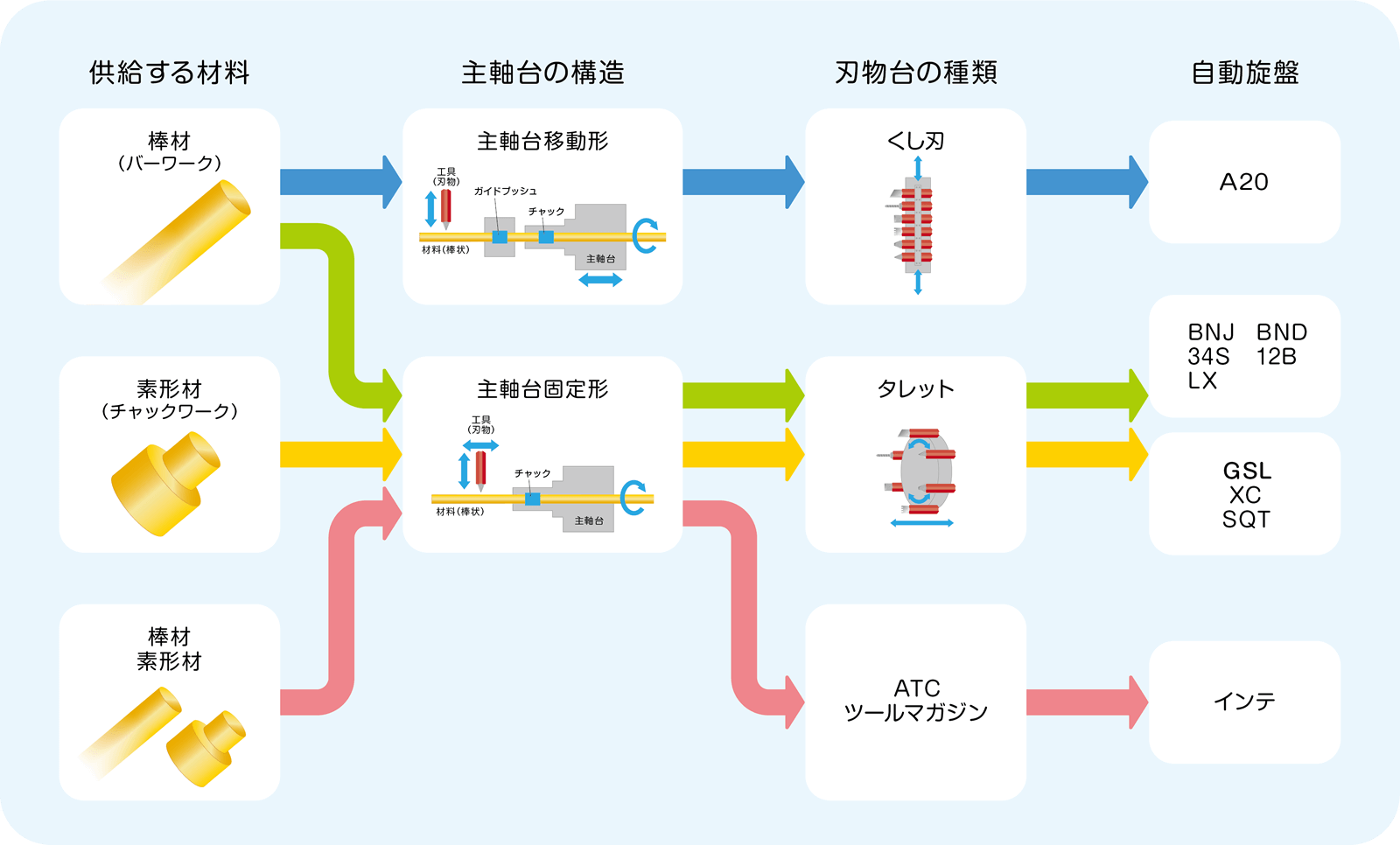 主軸台移動型には「くし刃刃物台」が、主軸台固定型には「タレット刃物台」が主に搭載されており、それぞれの加工用途に応じた構造となっています。
