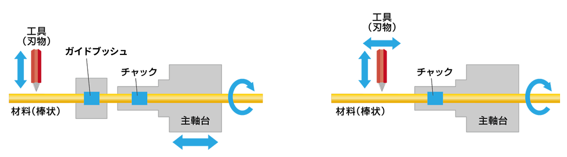機械の構造にも種類があります。材料をつかんでいるところ(チャック)に工具を当てても材料はたわみませんが、チャックから遠ざかるに従って材料はたわみやすくなります。そこで、細長いものを削るときに、材料がたわまないよう、工具の手前でいつも材料を支える道具を使います。この装置を「ガイドブッシュ」と呼びます。ガイドブッシュのある機械は、材料をつかんでいるチャックの方(主軸台側)を移動させるため、主軸台移動型と呼びます。一方、工具の方が移動する主軸台固定型の自動旋盤もあります。